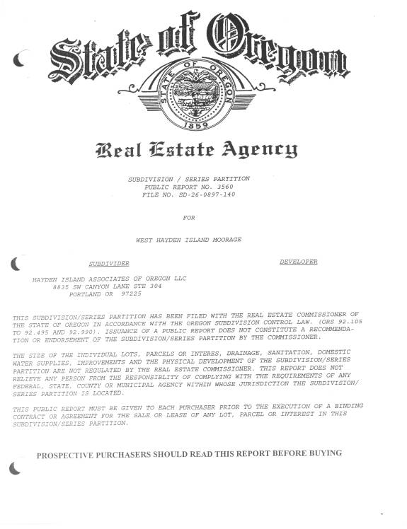 Declarant proposes to enter into moorage space subleases pursuant to which Declarant will lease to the leaseholders houseboat moorage spaces within the Moorage for terms coextensive with the term of the State Lease. The Declarant also proposes to provide each leaseholder with a right to use a garage space on the Upland. Such garage spaces and garage buildings will be common facilities owned by the association of leaseholders. Upon ninety (90) days following the sale of all of the moorage spaces within the moorage (or earlier if Declarant so elects), Declarant will convey to an association of such leaseholders fee title in the Upland, subject to all encumbrances, covenants, conditions, restrictions, licenses, and easements of record existing at the time of conveyance. Provided, however, the Upland shall be conveyed free and clear of all monetary encumbrances excepting those imposed pursuant to the Declaration of Covenants and Restrictions for Hayden Island Business Park and the State Lease. Declarant has further agreed that each such leaseholder will be a member of such association, and that within ninety (90) days after the sale of all of the moorage spaces within the Moorage, Declarant will assign the State Lease and convey fee title to the Moorage dock facilities to such association. Thereafter, the association of leaseholders shall perform all of the duties and obligations under the State Lease.