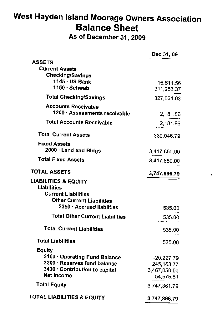 ASSETS Current Assets Checking/Savings 1100 · Petty Cash 5.34 1130 · Liberty Funds 28,380.51 1140 · Sterling Checking Account 721.18 Total Checking/Savings 29,107.03 Accounts Receivable 1200 · Assessments receivable 6,787.09 1300 · Developer receivables -136.30 Total Accounts Receivable 6,650.79 Total Current Assets 35,757.82 TOTAL ASSETS 35,757.82 LIABILITIES & EQUITY Liabilities Current Liabilities Accounts Payable 2300 · Vendor payables 19,121.44 + Total Accounts Payable 19,121.44 Other Current Liabilities 2200 · Developer payables 10,190.60 ++ Total Other Current Liabilities 10,190.60 Total Current Liabilities 29,312.04 Total Liabilities 29,312.04 Equity 3500 · Operating fund balance -19,337.89 3600 · Reserves fund balance 34,083.85 Net Income -8,300.18 Total Equity 6,445.78 TOTAL LIABILITIES & EQUITY 35,757.82