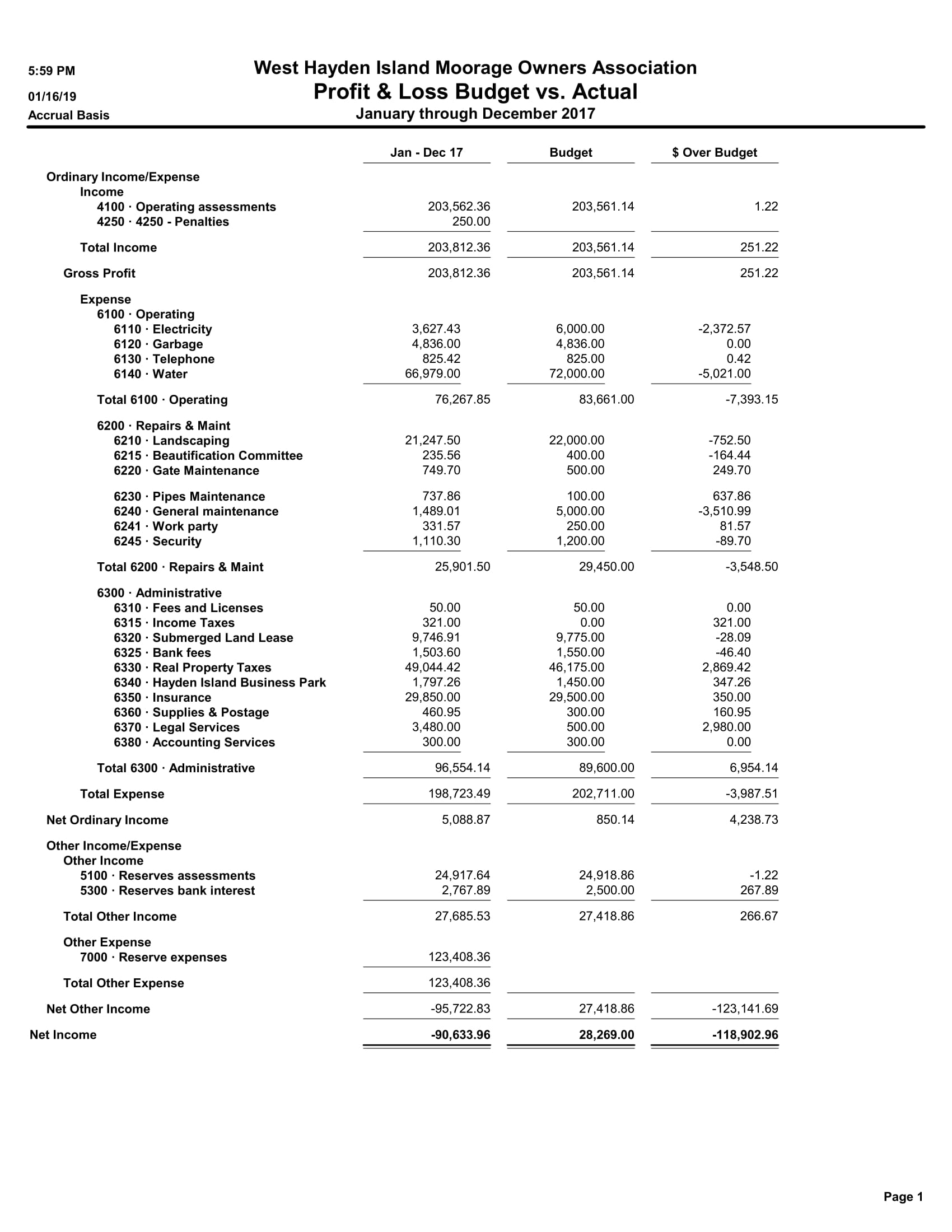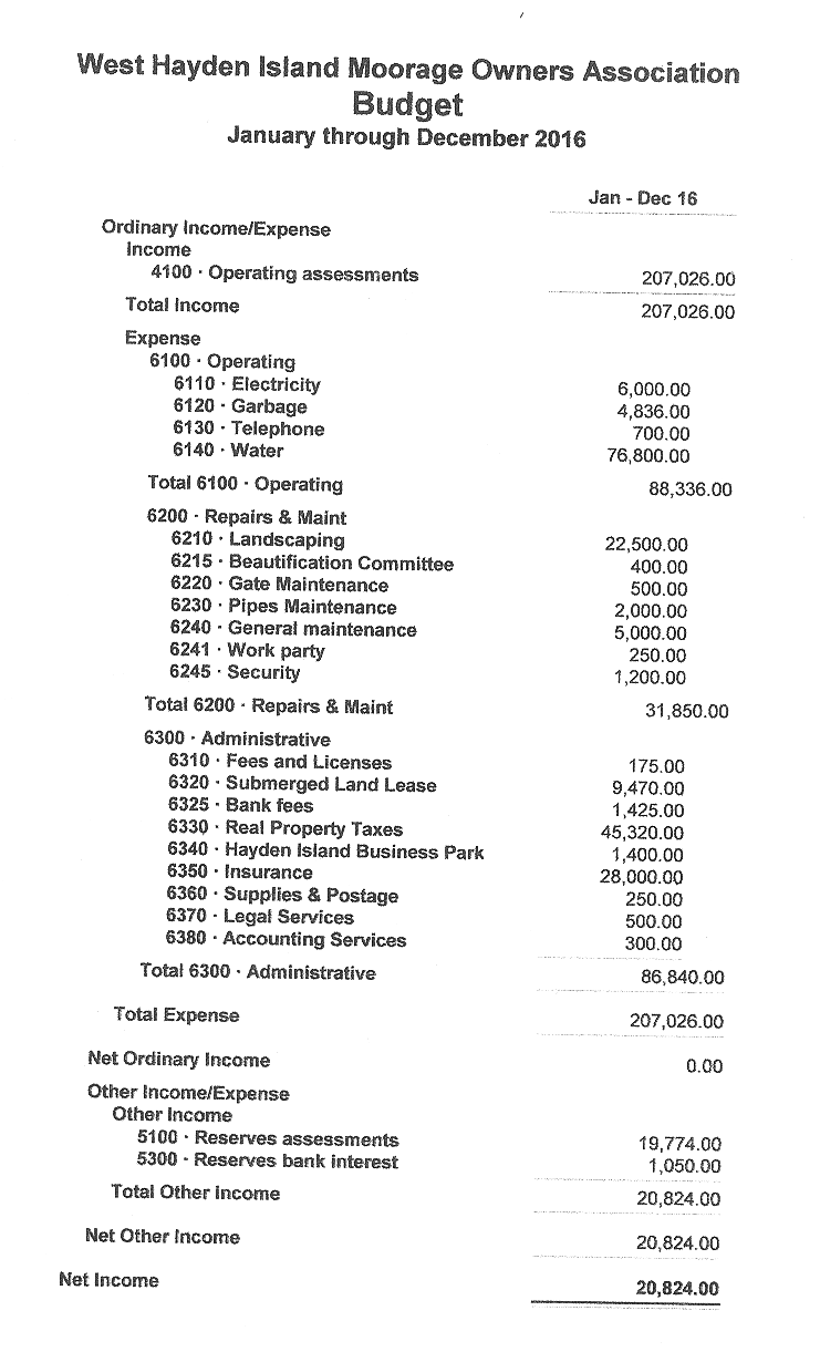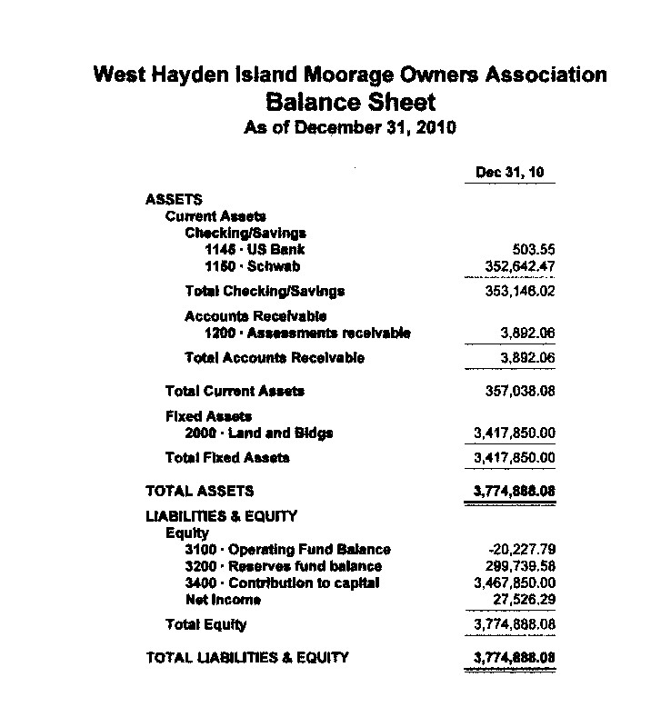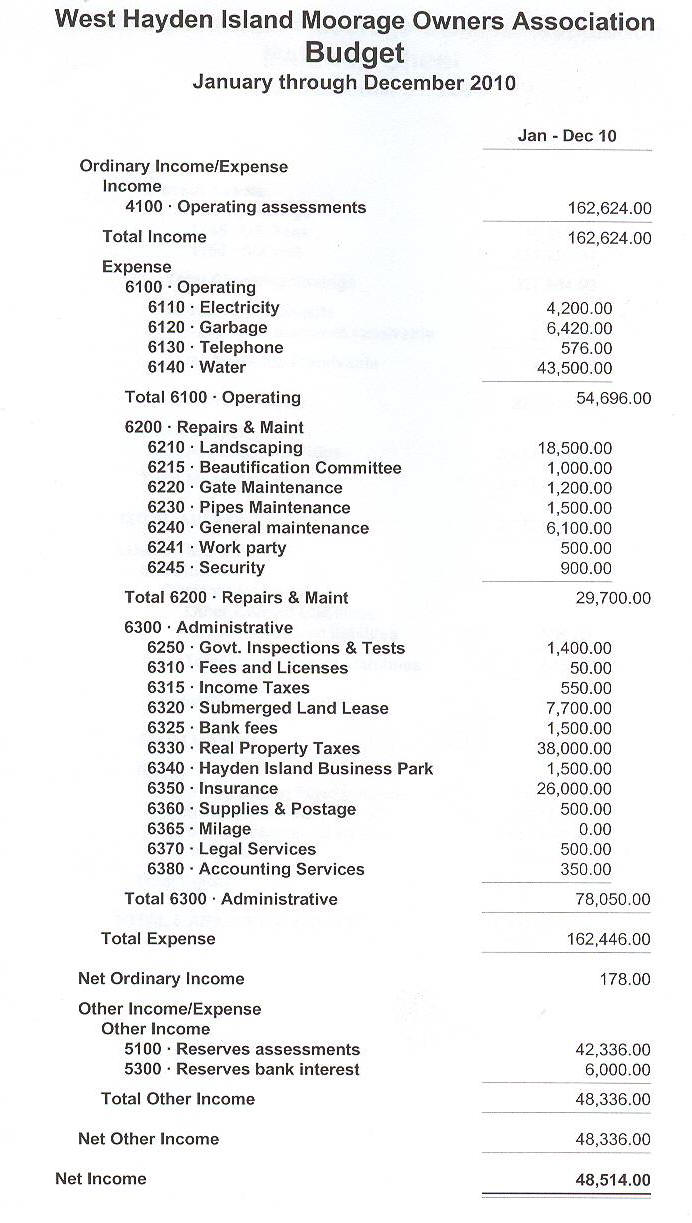 6300 · Administrative 6310 · Fees and Licenses 514.71 6320 · Submerged Land Lease 6,261.00 6330 · Real Property Taxes 31,530.98 6340 · Hayden Island Business Park 230.00 6350 · Insurance 17,258.37 6360 · Supplies & Postage 1,164.07 6370 · Legal Services 73.82 6380 · Accounting Services 4,066.10 6390 · Management Services 19,121.44 Total 6300 · Administrative 80,220.49 Total Expense 131,496.42 Net Ordinary Income -22,253.55 Other Income/Expense Other Income 5100 · Reserves assessments 13,682.91 5300 · Reserves bank interest 270.46 Total Other Income 13,953.37 Net Other Income 13,953.37 Net Income -8,300.18 |