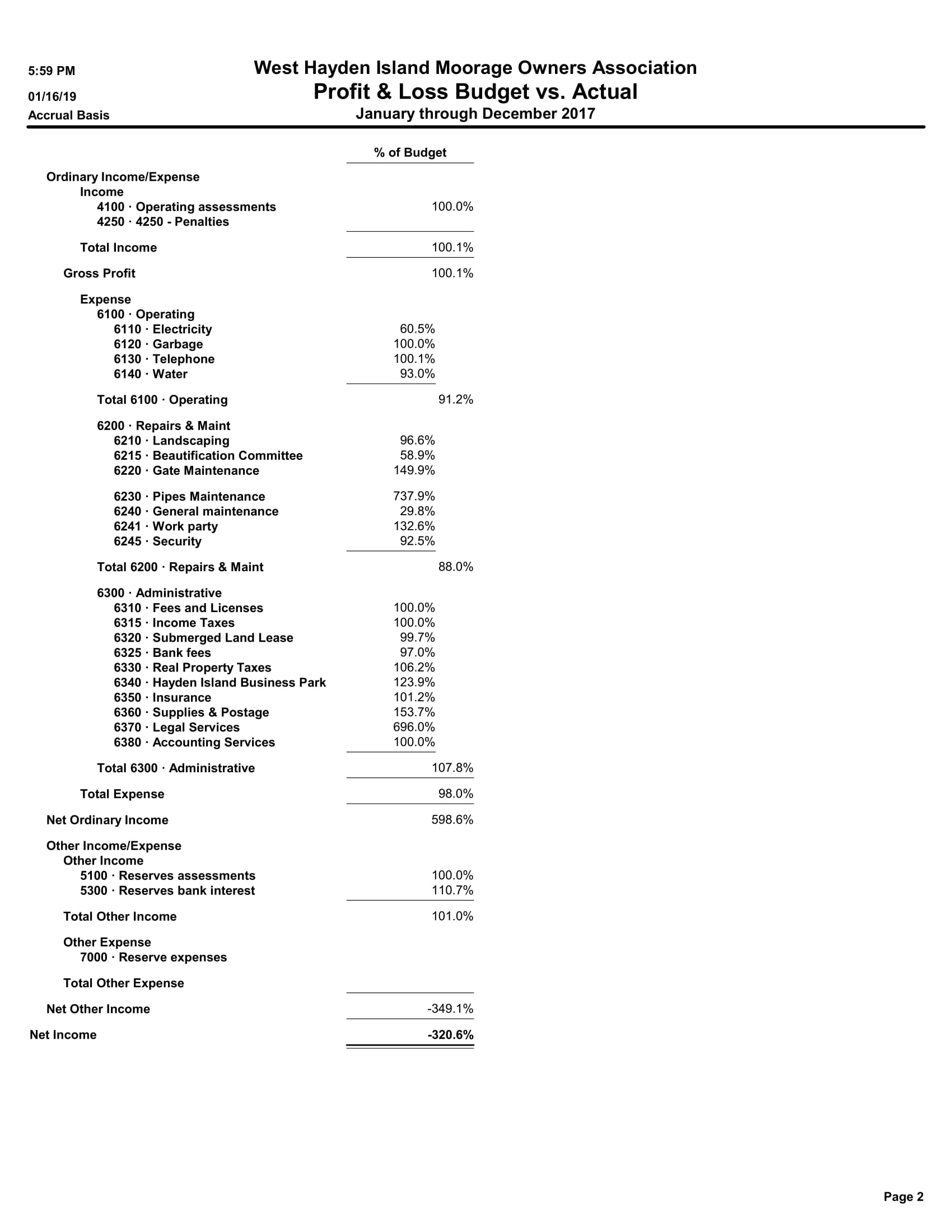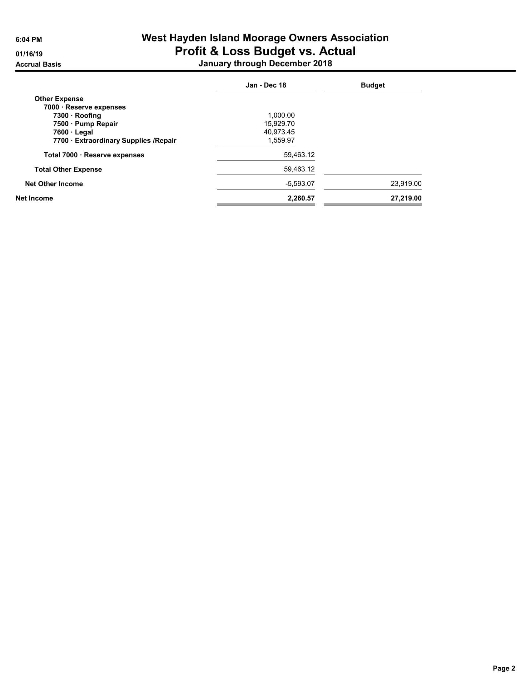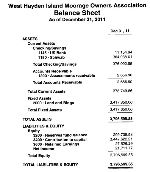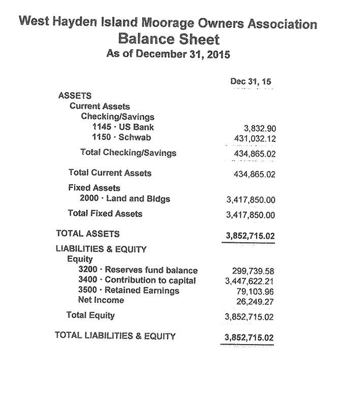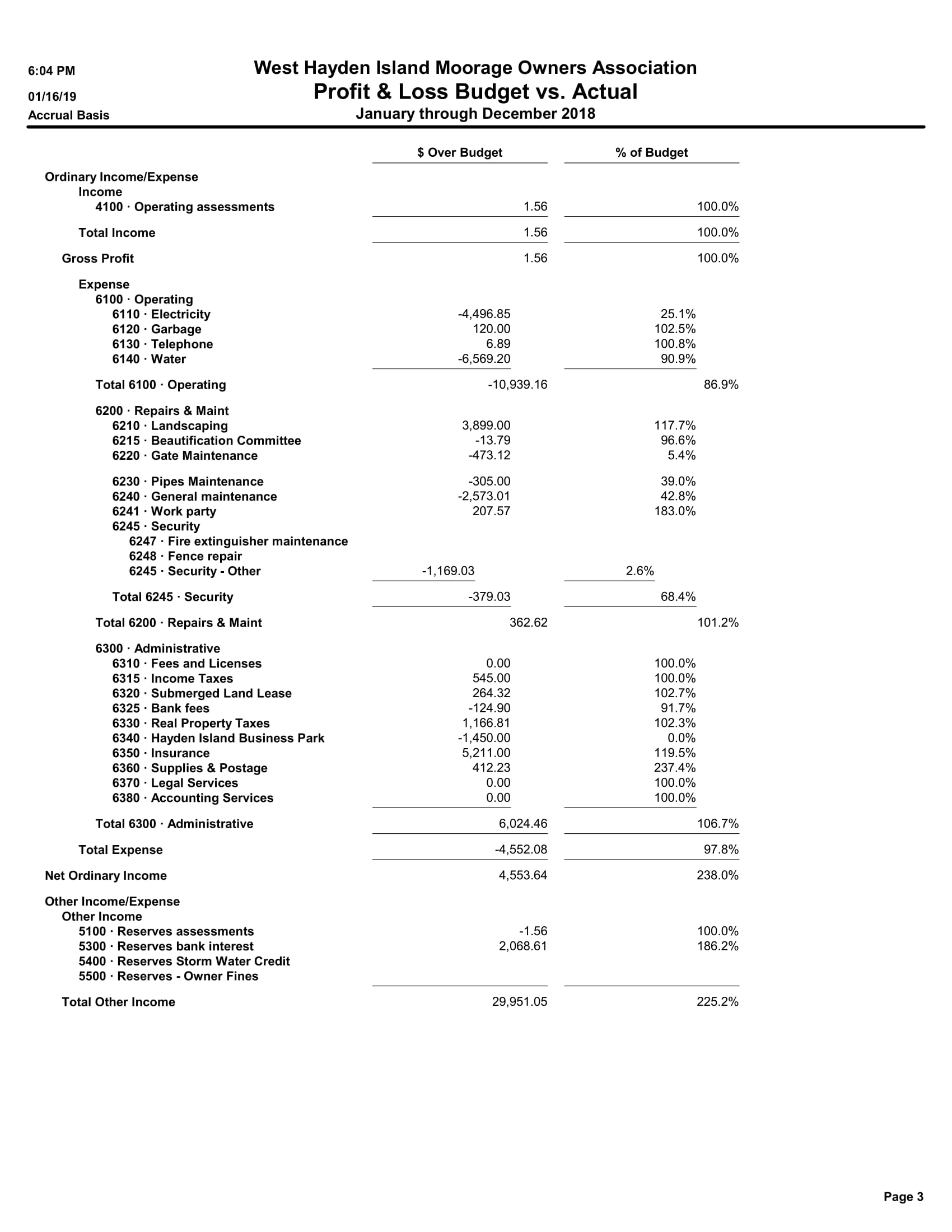 6300 · Administrative 6310 · Fees and Licenses 514.71 6320 · Submerged Land Lease 6,261.00 6330 · Real Property Taxes 31,530.98 6340 · Hayden Island Business Park 230.00 6350 · Insurance 17,258.37 6360 · Supplies & Postage 1,164.07 6370 · Legal Services 73.82 6380 · Accounting Services 4,066.10 6390 · Management Services 19,121.44 Total 6300 · Administrative 80,220.49 Total Expense 131,496.42 Net Ordinary Income -22,253.55 Other Income/Expense Other Income 5100 · Reserves assessments 13,682.91 5300 · Reserves bank interest 270.46 Total Other Income 13,953.37 Net Other Income 13,953.37 Net Income -8,300.18 |