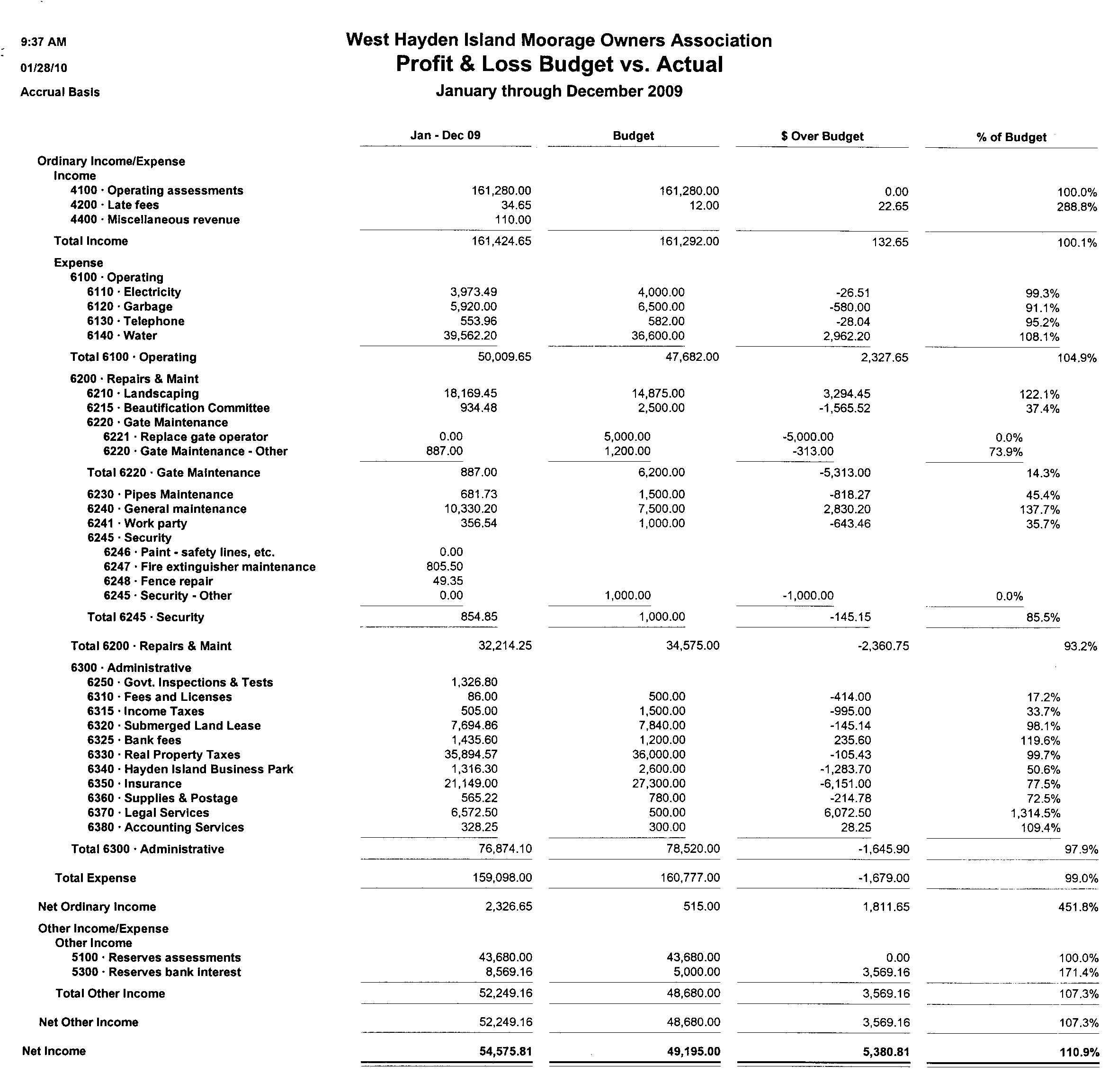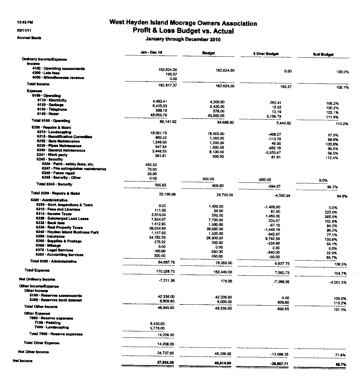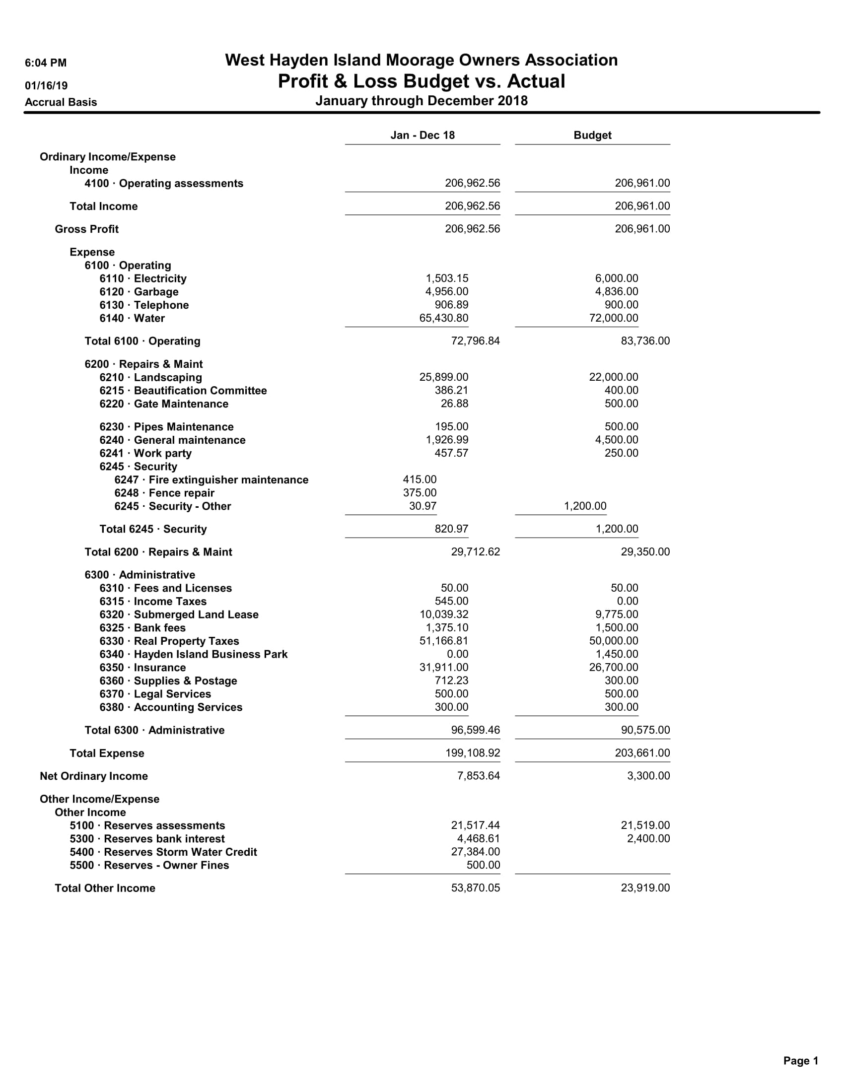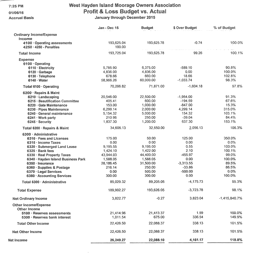 Ordinary Income/Expense Income 4100 · Operating assessments 109,200.00 4300 · Operating bank interest 17.87 4400 · Miscellaneous revenue 25.00 Total Income 109,242.87 Expense 6100 · Operating 6110 · Electricity 2,669.56 6120 · Garbage 6,553.00 6130 · Telephone 486.27 6140 · Water 20,214.52 Total 6100 · Operating 29,923.35 6200 · Repairs & Maint 6210 · Landscaping 11,946.68 6220 · Gate Maintenance 146.00 6230 · Pipes Maintenance 1,715.00 6240 · General maintenance 7,544.90 Total 6200 · Repairs & Maint 21,352.58